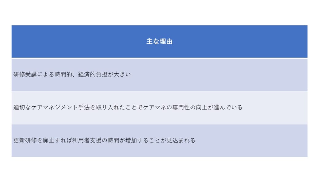 「更新研修廃止の方向性」という話が出たときに、心配されたのは地域や職能団体で行っている研修の受講者数が減少することです。そもそも、主任ケアマネジャーは年間で4回以上の研修受講が課せられていましたので、条件をクリアするために必死でした。しかし、この条件がなくなると、研修を受講する必要性がなくなるのでは?という考えに基づいて受講生の減少を懸念する声が上がっています。