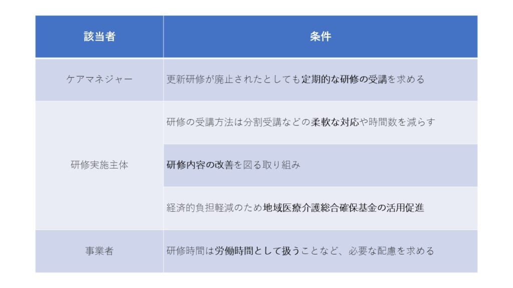 更新研修廃止の方向性に喜んだケアマネさんも大勢いたと思いますが、現実はそんな甘い話ではないようです。国は、更新制度を廃止する一方で、以下のような条件を求めています。