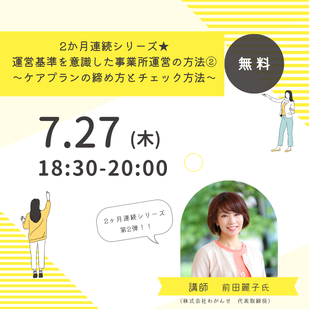 【内容】『2か月連続シリーズ★運営基準を意識した事業所運営の方法②』 ~ケアプランの締め方とチェック方法~